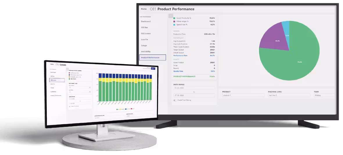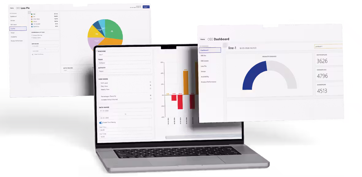 Met duidelijke OEE dashboards, slimme analyses en inzicht in productieprestaties wordt direct zichtbaar waar capaciteit verloren gaat en waar optimalisatie mogelijk is.